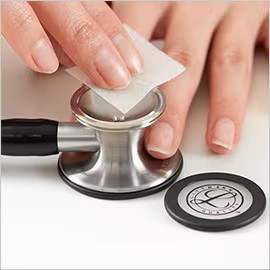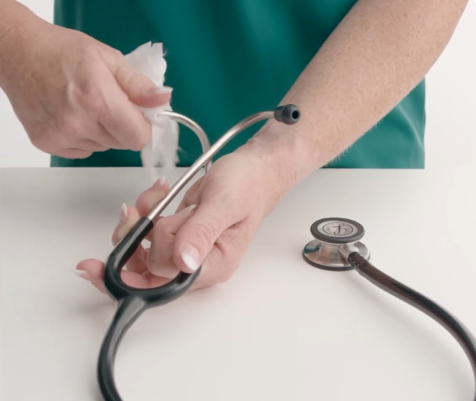 Best practice is to clean your stethoscope between patients and at the end of each shift. Approved methods include: